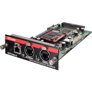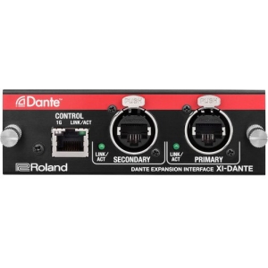 The Roland XI-DANTE is a Dante expansion interface card for Roland M-5000 Series live mixing consoles and the V-1200HD video switcher. It enables full-duplex, two-way communication on a maximum of 64 channels at 48 kHz / 24-bit or 32 channels at 96 kHz / 24-bit. The card features primary and secondary Dante ports to allow for redundancy or daisy-chained Dante-enabled devices.