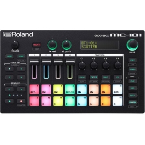 The highly portable Roland MC-101 is smaller brethren of the latest flagship groove box, the MC-707, but in a pint-sized package that operates on batteries. The unit features four tracks of recording, sequencing, synthesis, sample-playback, and effects, plus a curated palette of sounds, loops, and phrases. Import loops and sequence MIDI with deep control over timing, while tweaking faders and knobs for the ultimate “in-the-moment” experience.