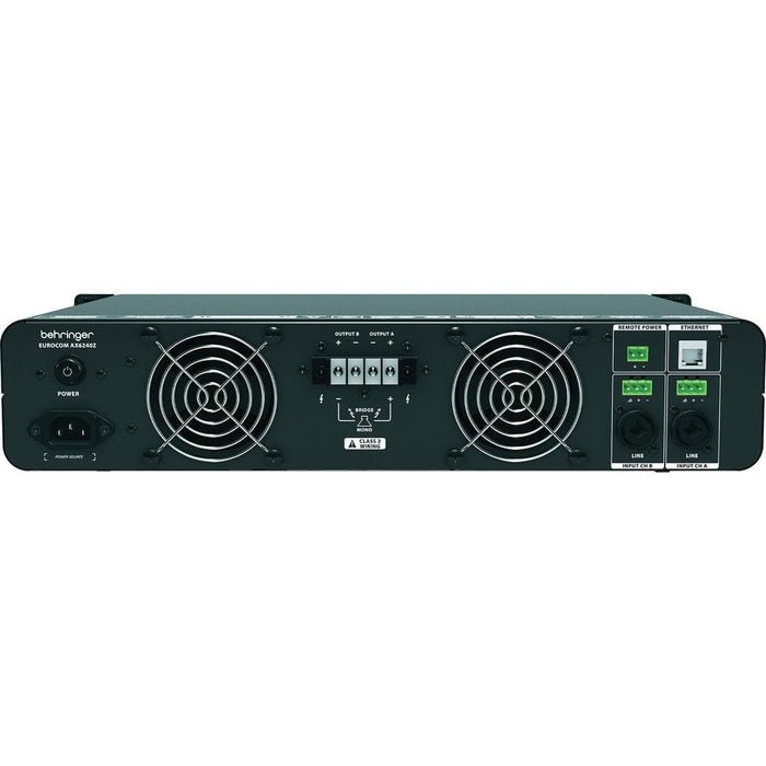 Featuring comprehensive digital signal processing (DSP) and remote setup via Ethernet / USB in a 2U rack-mountable, fan-cooled chassis, the AX6240Z 900W 70/100V High-Impedance Power Amplifier from Behringer is a professional, high-performance, 2-channel power amplifier for installation with 70 / 100V distributed speaker systems. This system delivers up to 700W RMS per channel at 70V (7?), up to 1000W RMS per channel at 100V (10?), up to 350W RMS per channel at 70V (14?), and up to 500W RMS per channel at 100V (20?). It utilizes transformer-less, class-D topology and switch-mode power technology to provide low noise and good transient response while reducing amplifier energy costs. The dual variable-speed fans create back-to-front ventilation to keep racks running cool, and zero-attack limiters combine with independent DC and thermal overload protection to safeguard the amplifiers and connected speaker systems. Featuring 24-bit / 96 kHz converters to ensure signal integrity, the processing section of this AX6240Z amplifier maintains an broad dynamic range while offering sophisticated DSP options including delay, crossover, dynamics, and both parametric (8-band) and dynamic (2-band) EQ.