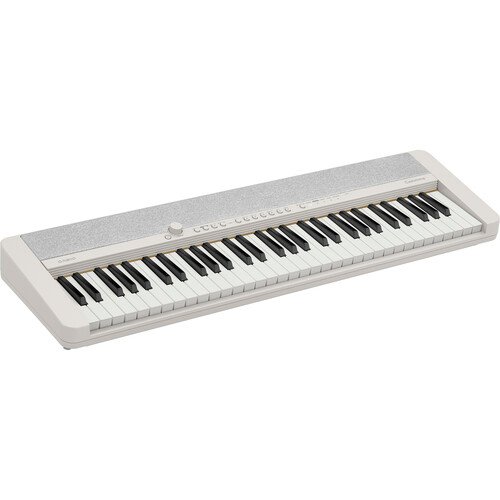 The white Casio Casiotone CT-S1 is a stylish 61-key portable keyboard offering high-quality sound, user-friendly playability, built-in stereo speakers, and versatile connectivity options including aux input, headphone output, micro-USB, and USB Type-A ports. It features onboard effects like reverb, chorus, and delay, a one-button song recorder, and compatibility with the Chordana App for learning MIDI files. The keyboard includes a music rest and AC adapter, and can also run on six AA batteries (sold separately) for mobile use.