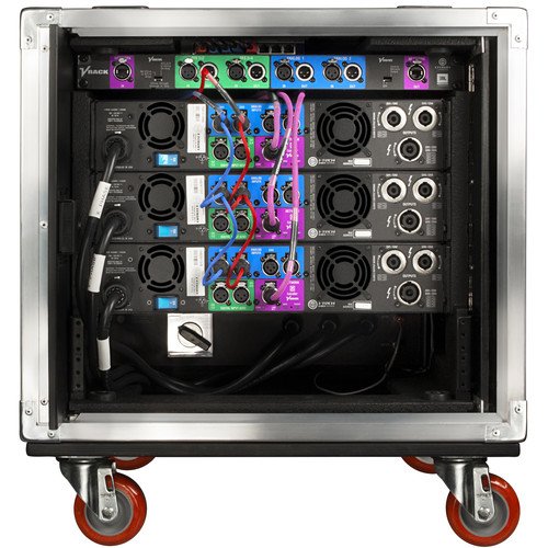 Equipped with versatile CobraNet, AES/EBU, and analog XLR connections, the VRack Amplification System offers seamless integration into various audio setups. The front-mounted power panel ensures secure connections with its 5-pin Hubbell Twist-Lock and 5-pin CEE-Form connectors. Built with durable materials like the Colson 3.5″ polyurethane casters and featuring a Polycarbonate see-through door, this rack system guarantees enhanced mobility and protection.
