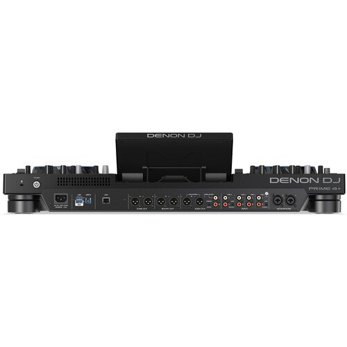 The Prime 4+ sports an enhanced appearance, dynamic new FX options, and a 10% larger jog wheel surface. It also includes future-proof features like standalone Stem separation. The rear panel features balanced XLR connectors for main, booth, and zone outputs, as well as dual combo XLR-1/4″ microphone inputs. External media players and turntables can be connected via the four RCA inputs. Other hardware connectivity includes Ethernet link, USB ports for flash drives, and MIDI controllers.