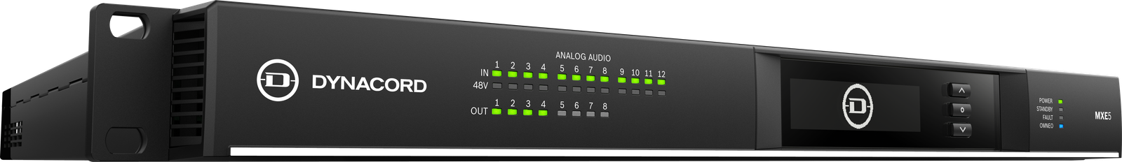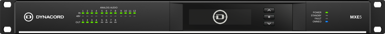 The MXE5 is the first member of the MXE matrix mix engine series. This 24 x 24 crosspoint performance audio matrix offers both routing and mixing functionalities, equipped with 12 analog mic/line inputs, eight line outputs, and 24 Dante audio channels. It serves as a communications hub for all IP-based peripherals, providing comprehensive supervision of all system-wide commands.