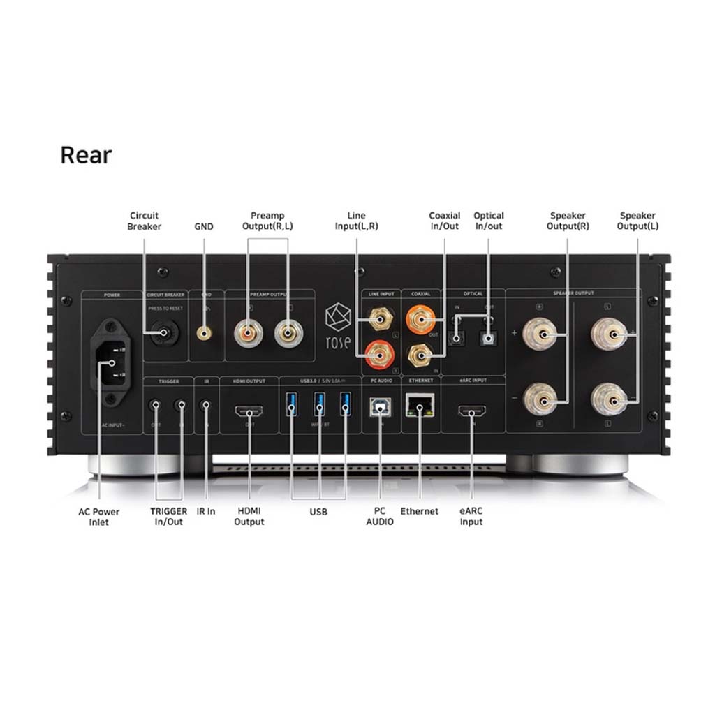 | Streaming & Network | AirPlay, DLNA, Roon Ready, Spotify Connect, Bluetooth; TIDAL, Qobuz, Apple Music, ROSE Tube, Internet Radio, ROSE Podcast |