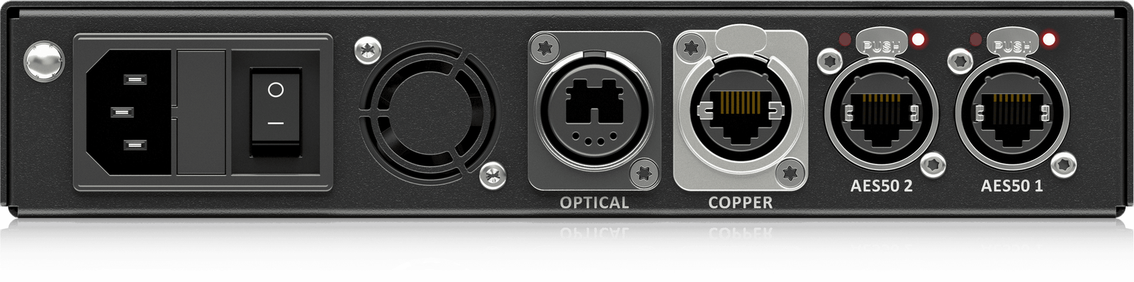 - Allows extension of two AES50 connections up to 500 meters via optical fiber or 100 meters via Cat5 cable