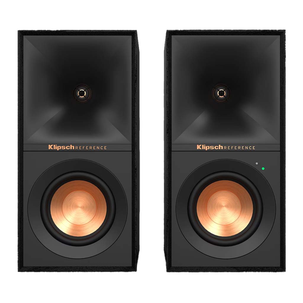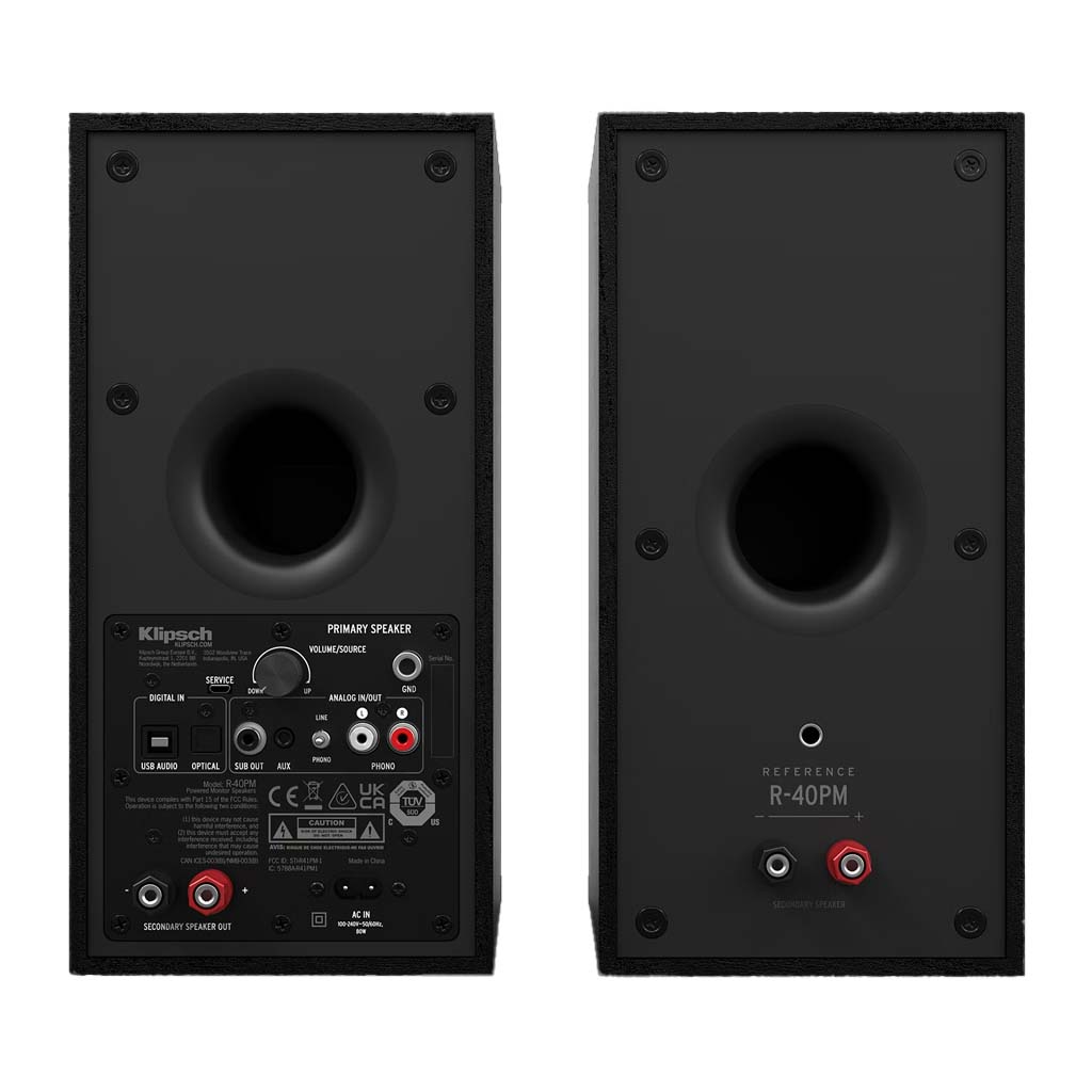 The Klipsch R-40PM are compact powered bookshelf speakers with built-in amplification, Bluetooth streaming, an integrated phono preamp, digital (USB/optical) and analog inputs, copper-spun TCP woofers and 1″ LTS aluminum tweeters mated to edge-to-edge Tractrix® horns for wide, detailed sound — no AV receiver required.
