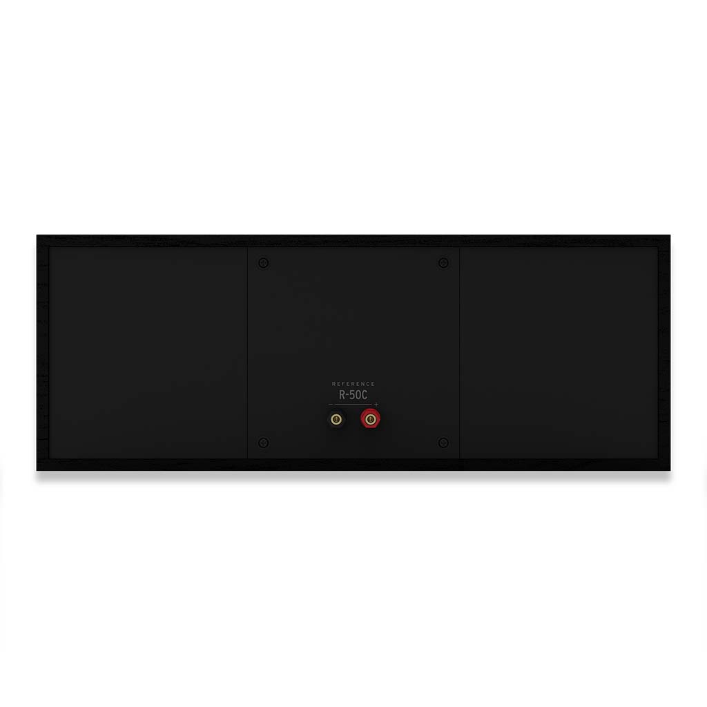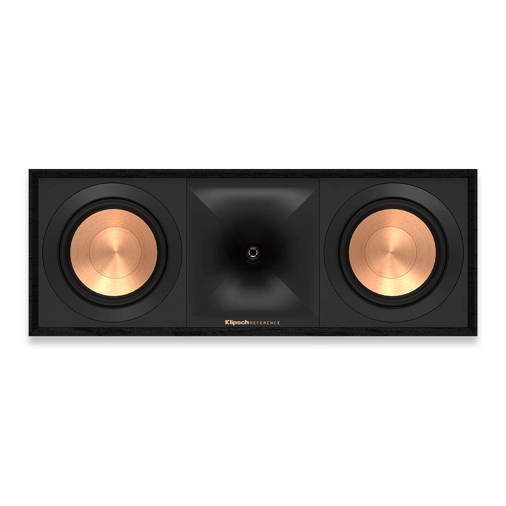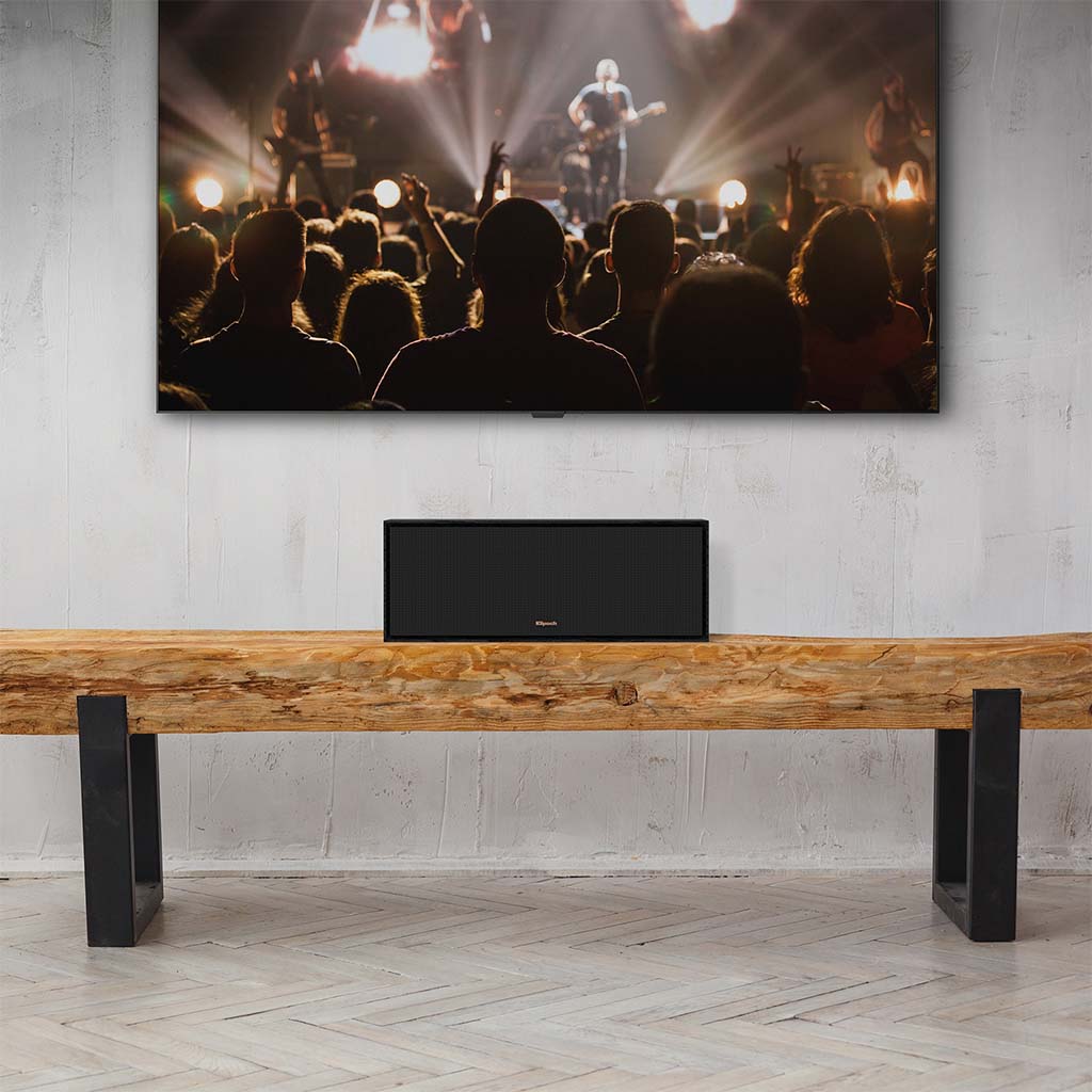 All-new Klipsch R-50C center channel with a 90° x 90° Tractrix® horn, 1″ LTS aluminum tweeter and dual 5.25″ spun-copper TCP woofers — designed to deliver improved dialogue clarity and a precise soundstage in a slim MDF cabinet.