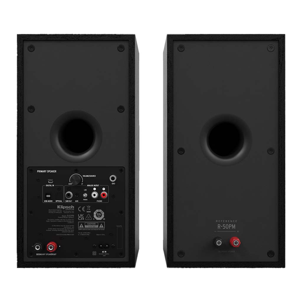 Plug & play, fuss-free — the Klipsch R-50PM pair is a set of powered monitors that eliminate the need for an AVR or separate amplifier. Just plug the speakers into power (they connect to each other), add a source via Bluetooth®, optical, USB, phono/line, or analog inputs, and enjoy tuned Klipsch Reference sound. The R-50PM widens the soundstage with an edge-to-edge 90° × 90° Tractrix® horn mated to a 1″ aluminum LTS tweeter for clear, efficient highs, while the spun-copper TCP 5.25″ woofer and extra cabinet depth deliver warm bass down to the mid-50s Hz — plus an RCA line output if you want to add a subwoofer later. The speakers include an internal amplifier (60 W per side, 120 W total cont.) and handy accessories like a remote, speaker wire, and USB cable so you can set up quickly.