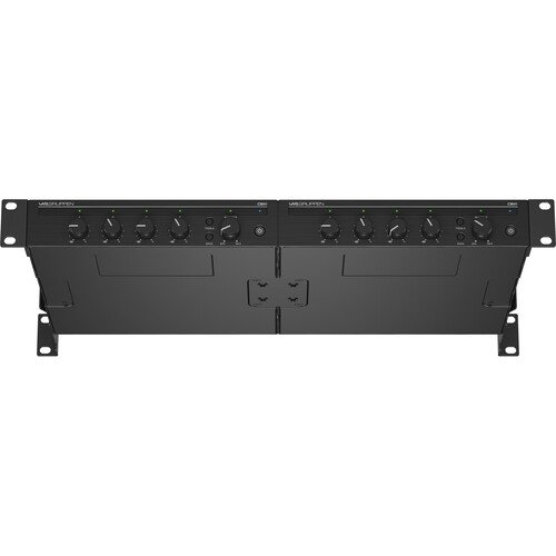 The rear panel offers four mic/line input channels that sum to mono. Channel A features a 3-pin Euroblock input with two additional pins that activate the priority function when shorted together. Channels B, C, and D offer balanced 3-pin Euroblock connectors and a pair of unbalanced RCA connectors (summed to mono) for connecting stereo sources such as players, phones, computers, and more. A 3-pin Euroblock output is provided for connecting to additional devices. The RJ45 port allows the mixer to be controlled via Ethernet from a broad range of remote-control options, such as the CRC-V Series of wall-mount controllers and the stylish tabletop controller, the LAB.Level (sold separately).