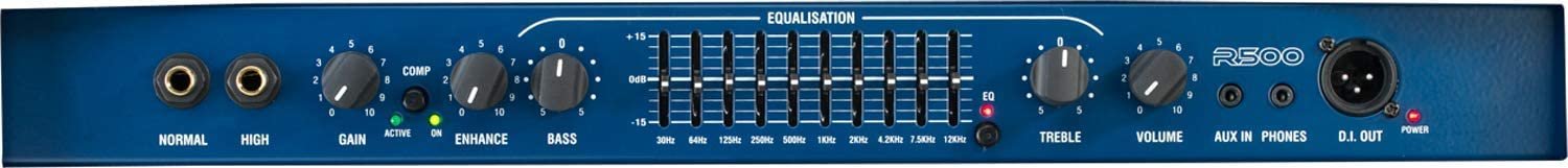 The Laney R500-115 is a solid-state combo packing an impressive 500W RMS into a sealed cabinet providing versatility, portability and reliability to all levels of bass player from rehearsal room to a large stage. The front panel houses Normal or High jack inputs a balanced XLR D.I. provides direct, mic-free mixer connection when recording or performing live. An Aux input allows play-along to a backing track and a headphone socket allows for late night playing. The R500-115 lets any bass player own their tone. Compressor Tuner out Speakon Connectors Single Channel 1 x 15” custom driver + HF Horn 10 band Graphic EQ Item dimensions: 563mm x 523mm x 365mm (HWD) Carton dimensions: 650mm x 585mm x 430mm (HWD) Item weight: 23.30kg.