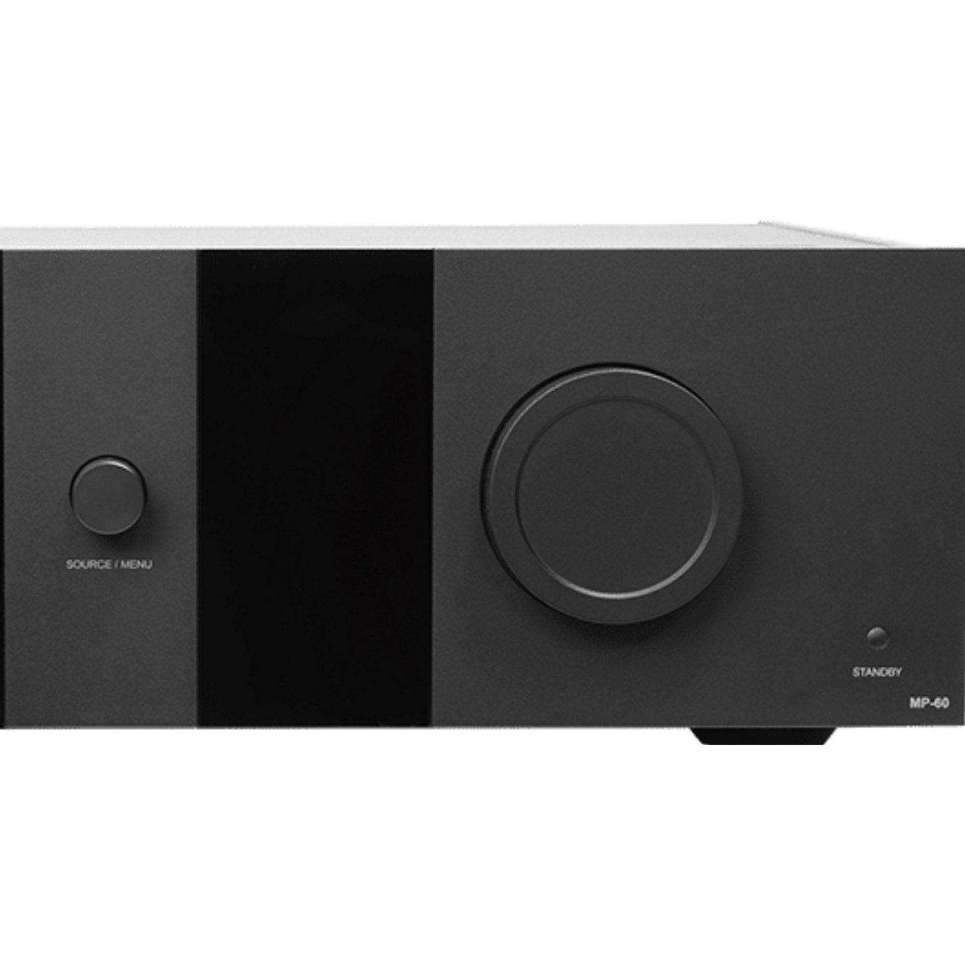 Video and HDMI handling are state-of-the-art: the MP-60 supports HDMI 2.1 features (including eARC, Dynamic Lip-Sync, QMS and 40 Gbps FRL), accepts 8K/4K high-frame-rate signals (8K30, 8K60 YCbCr 4:2:0, 4K120) and passes HDR metadata (HDR10+, Dolby Vision, HLG). The processor also supports VRR, Quick Frame Transport and ALLM for optimal gaming and video performance.