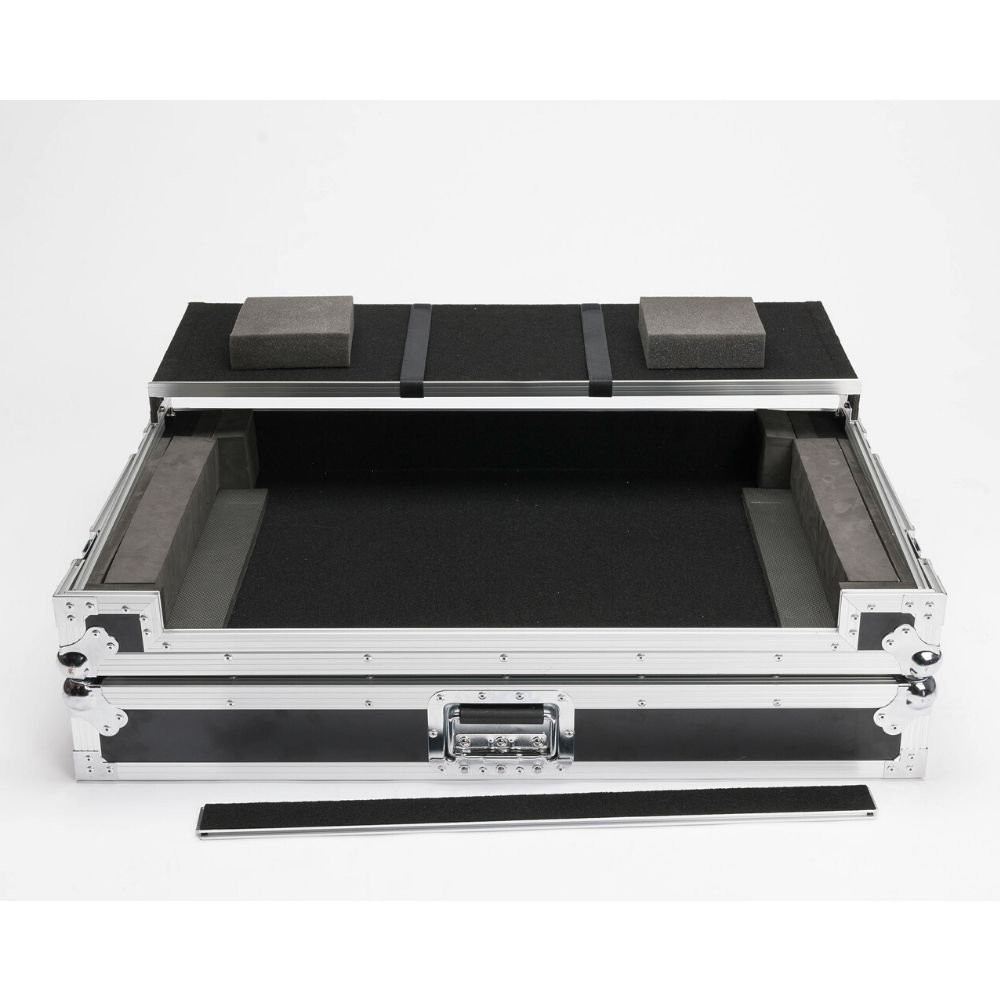 This custom case is designed to secure the Pioneer DDJ-SZ or DDJ-RZ DJ-Controller and a laptop, offering transport and workstation functionality. Constructed from 9 mm vinyl laminated plywood with robust aluminum profiles and heavy-duty butterfly latches, it ensures safe handling. The integrated gliding laptop platform and convenient cable access port enable quick and efficient setup.