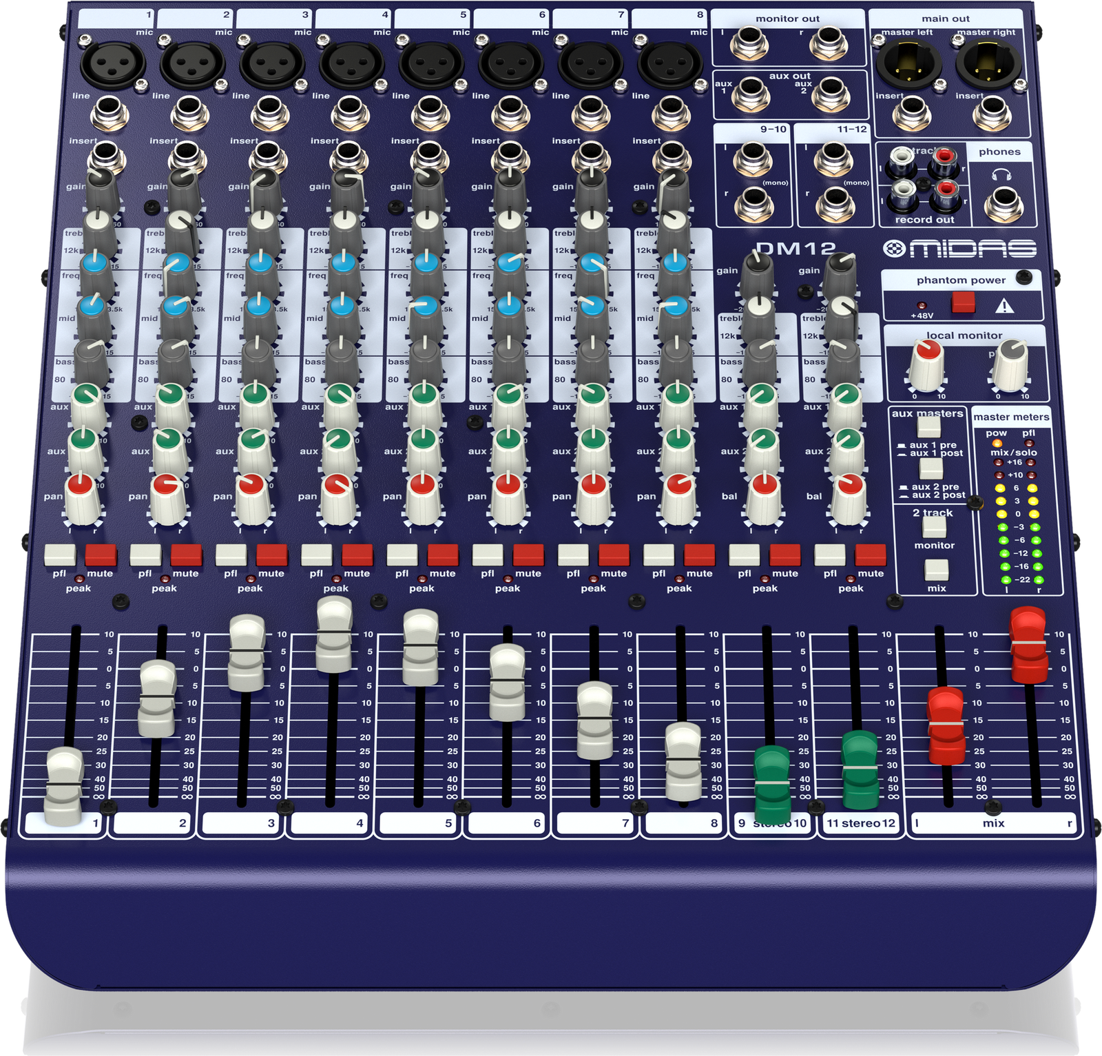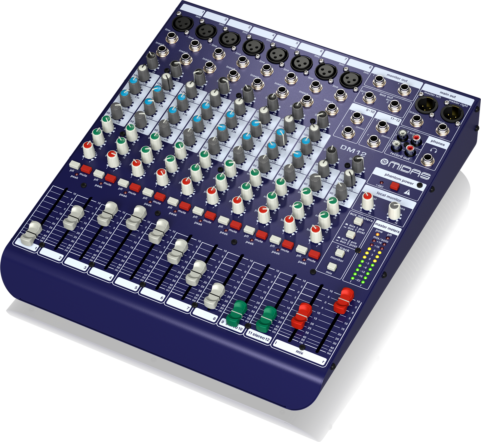 What is the secret behind DM12’s superb, studio-quality sound? The DM12 features 8 award-winning, Midas microphone preamplifiers with true +48 V Phantom Power, acclaimed by audio engineers the world over for their transparency and nuanced low noise, high-headroom design. Add to this TRS Line Inputs on all 12 channels (8 mono and 2 stereo), mono channel Inserts and 3-band EQ with mid-frequency sweep, 2 switchable pre/post-fader aux sends, 2 monitor outs and 2-track RCA I/O, and you have an analogue work of art – the fully featured DM12!