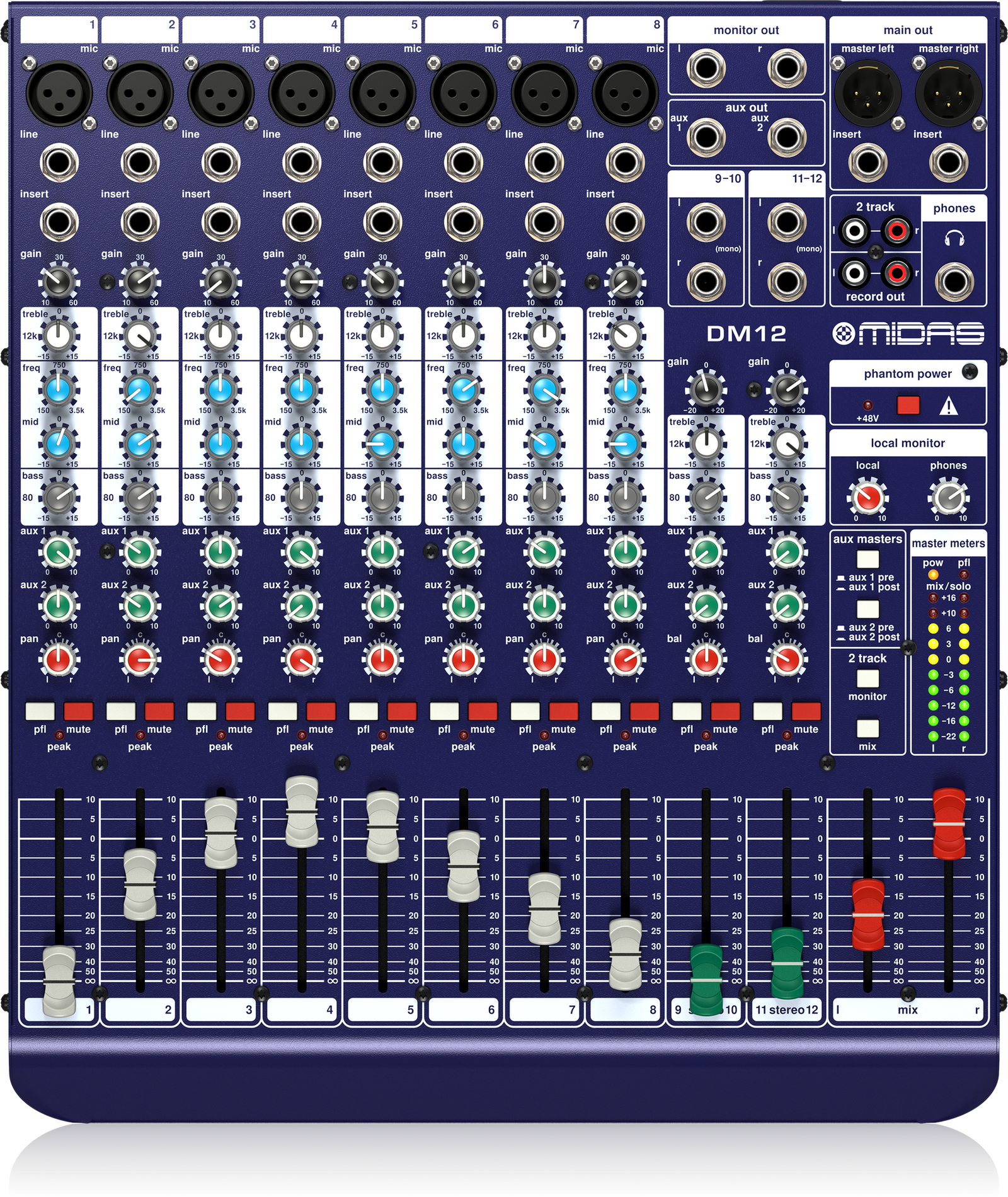 The DM12 is a compact mixing console ideal for stage or studio use, delivering excellent sonic performance and versatility. It features 8 Midas microphone preamplifiers with +48V Phantom Power, known for their transparency and low noise. All 12 channels include TRS Line Inputs, mono channel inserts, and 3-band EQ with mid-frequency sweep. Additional features comprise pre/post-fader aux sends, monitor outs, and 2-track RCA I/O, making the DM12 a comprehensive and affordable analogue mixer.