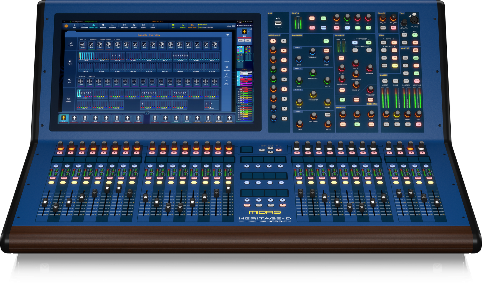 The Midas HD96-24-CC-IP from the Heritage D series is a 144-input digital mixing console featuring eight Midas preamps, 120 mix buses, 24 VCA groups, and advanced digital effects. It includes 28 motorized faders, touch-sensitive controls, a 21-inch multi-gesture touchscreen, HyperMAC and AES50 networking, dual Ultranet ports, and a dual network bridge format converter, all supported by an integrated wireless transceiver module and dual redundant power supplies.