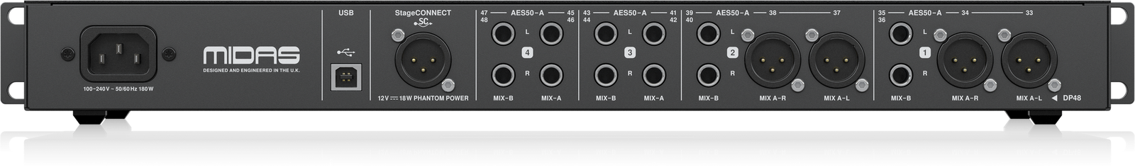 - Allows connection and powering of Midas DL8 Stage Boxes from ports 1-4.
