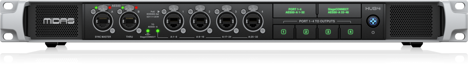 The Midas HUB4 stands as the essential tool for your stage rack, expertly managing both analogue and digital outputs for various applications. With the capability to supply up to four DP48 personal monitor mixers via PoE (Power over Ethernet) and facilitating 48 channels of 24-bit / 48 kHz audio, the HUB4 ensures seamless performance. It also efficiently gathers 48 channels of upstream audio, forwarding it to the FOH console from stage boxes connected to the AES50-B (THRU) Port or 8 return channels from each of Ports 1-4.