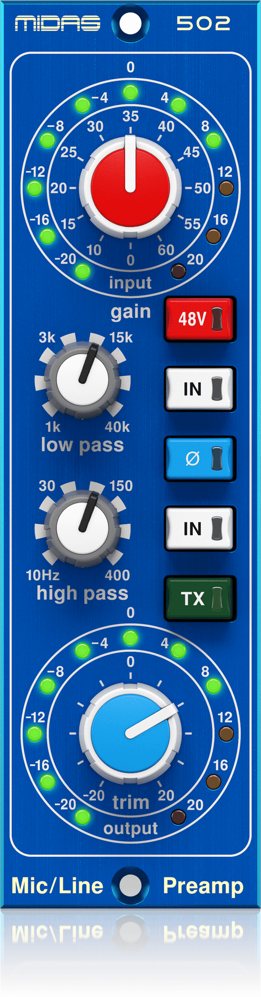 - Legendary Midas input allows up to +24 dBu signal levels with no pad while featuring the much loved soft clipping characteristic