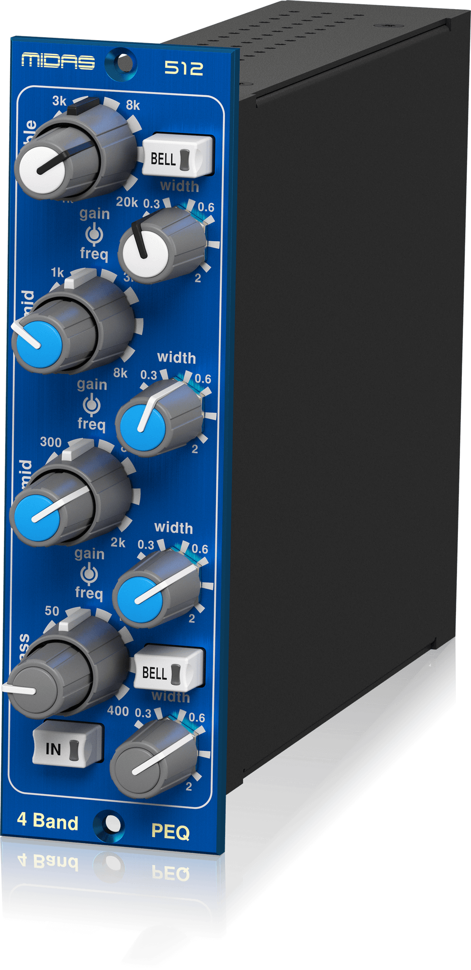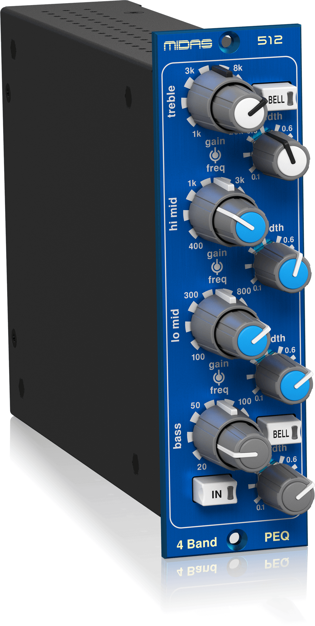 The PARAMETRIC EQUALISER 512 is a compact 500 Series 4-band fully parametric equaliser, derived from the iconic Midas HERITAGE 3000 mixing console. When integrated with the LEGEND L10, L6, or other standard 500 Series rackmount chassis, the 512 delivers an ideal EQ solution featuring upgraded, premium-quality performance.