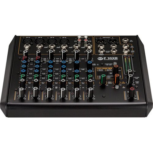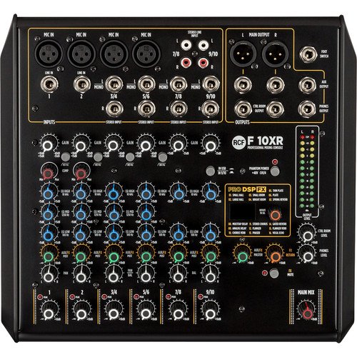 The RCF F-10XR is a mixer designed for live sound applications. It has 4 mic preamps, 2 mono line inputs, and four stereo line inputs. Line connections can be made over 1/4″ connections or RCA terminations. You’ll find 3-band EQs on the mono channels, and 2-band EQs on the stereo line inputs. Single-knob compressors are available on channels 1 and 2, and phantom power is available on all microphone inputs.