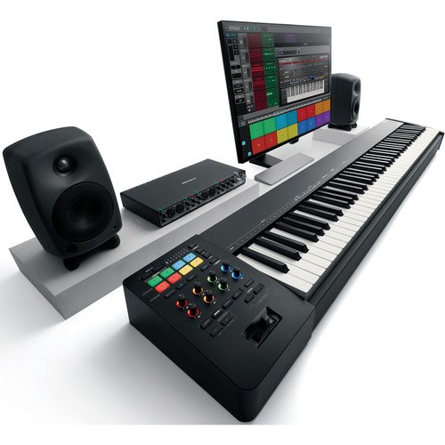 The A-88MKII is equipped with eight assignable pads with illumination, eight assignable knobs with illumination, a pitch-bend/modulation lever, two assignable buttons, and two damper pedal inputs. Other features include: 5-pin MIDI in and out connectors and a USB Type-C computer port. Additionally, power is supplied from the computer via the USB computer port or optional AC adapter. Both USB Type-C to USB Type-C, and USB Type-C to USB Type-A cables are included.