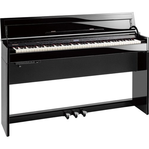 The classic, polished ebony DP603-PEC from Roland is a digital home piano with authentic piano sounds and a slim, minimalist design that complements modern living spaces.