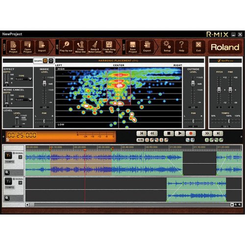 The R-MIX Audio Processing Software from Roland provides visual audio manipulation, which is powered be V-Remastering technology that was developed in conjunction with VariPhrase. This software lets you see various components of a stereo mix as color-coded clouds. This method of interfacing with an audio file allows you to select individual components of a mix and freely edit them to create karaoke files, study tools, remixes, and mash-ups. Old recordings can be cleaned up by applying noise reduction and effects.