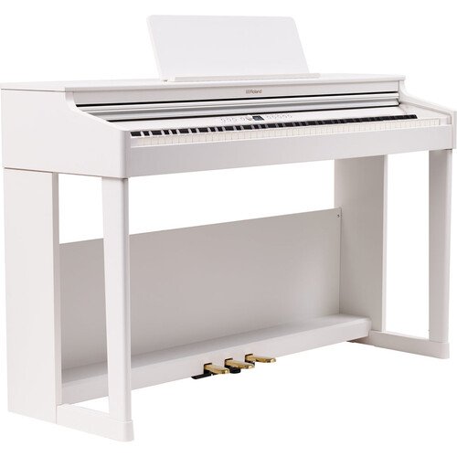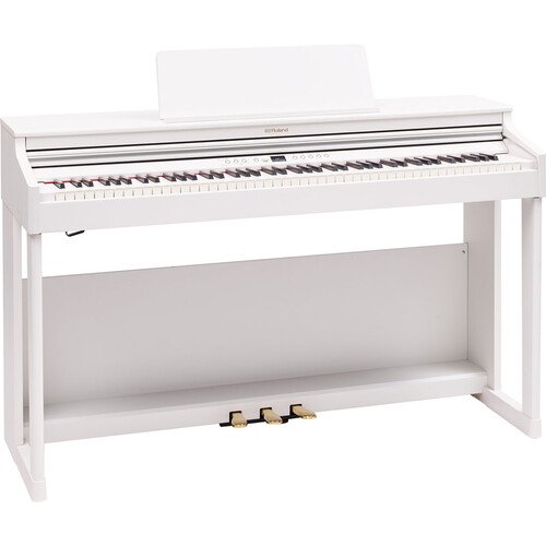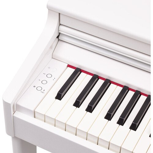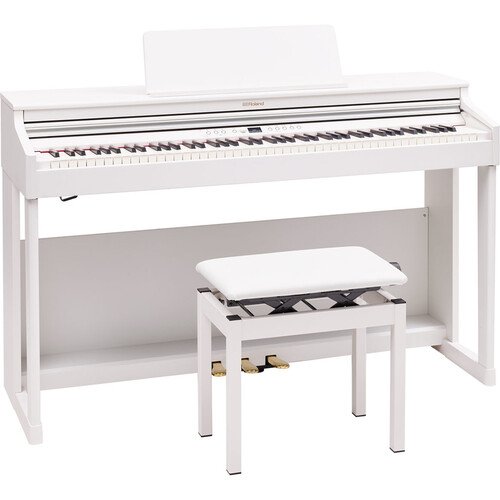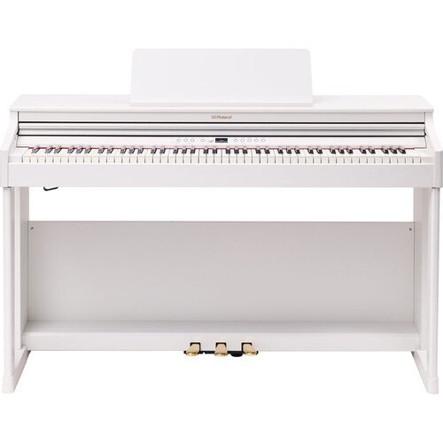 The white RP701 88-Key Classic Digital Piano with Stand and Bench from Roland brings families and beginning players a rewarding playing and practicing experience in a compact, streamlined instrument, elegantly crafted with a traditional upright appearance designed to complement any home.