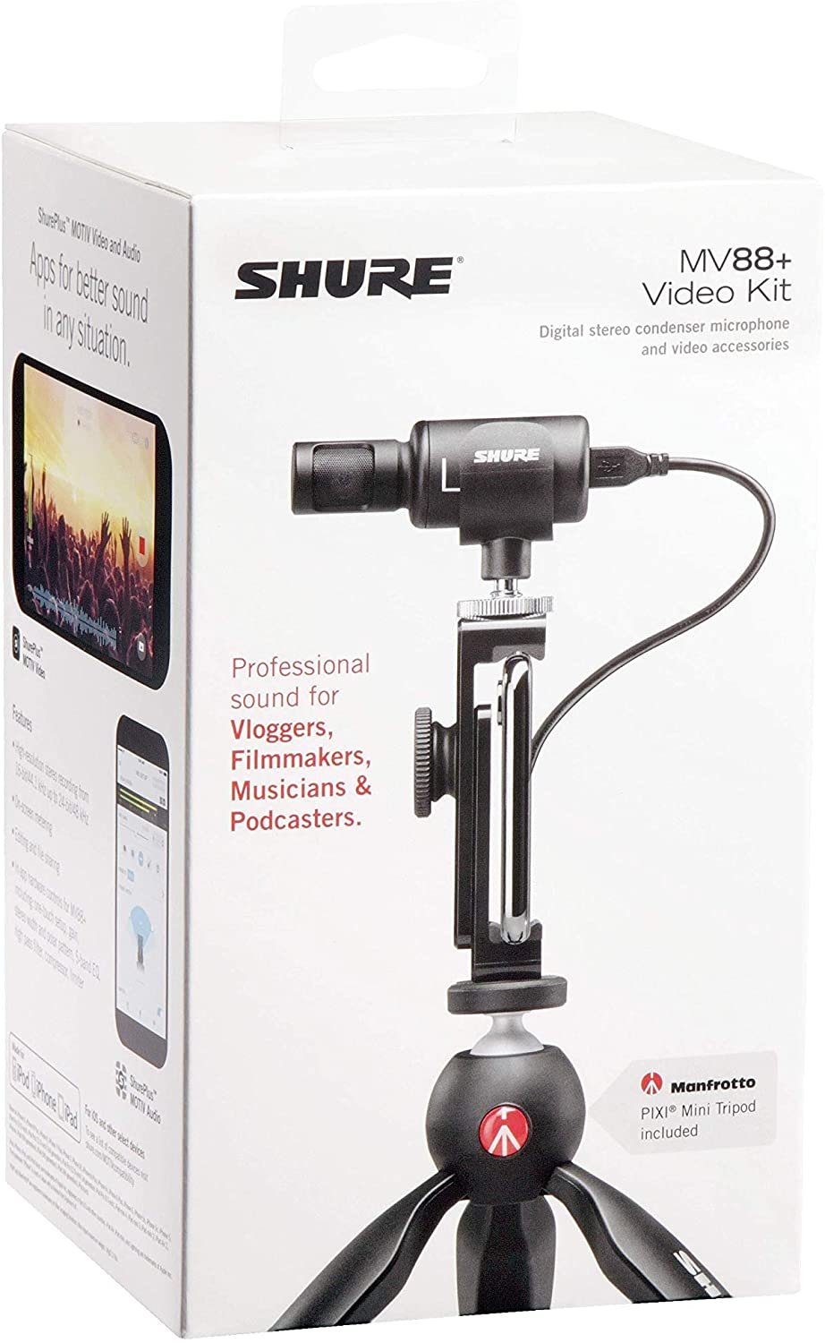 The kit is centered around the MV88+ microphone, specifically engineered to deliver Shure’s broadcast-quality sound to your phone, and adds all the accessories needed to create a portable and versatile audio/video rig that is self-contained and easy to use. Whether reporting from the field, streaming on Facebook Live, shooting a documentary, recording your vlog, or capturing a musical performance, the kit delivers great-sounding video—wherever the action is.