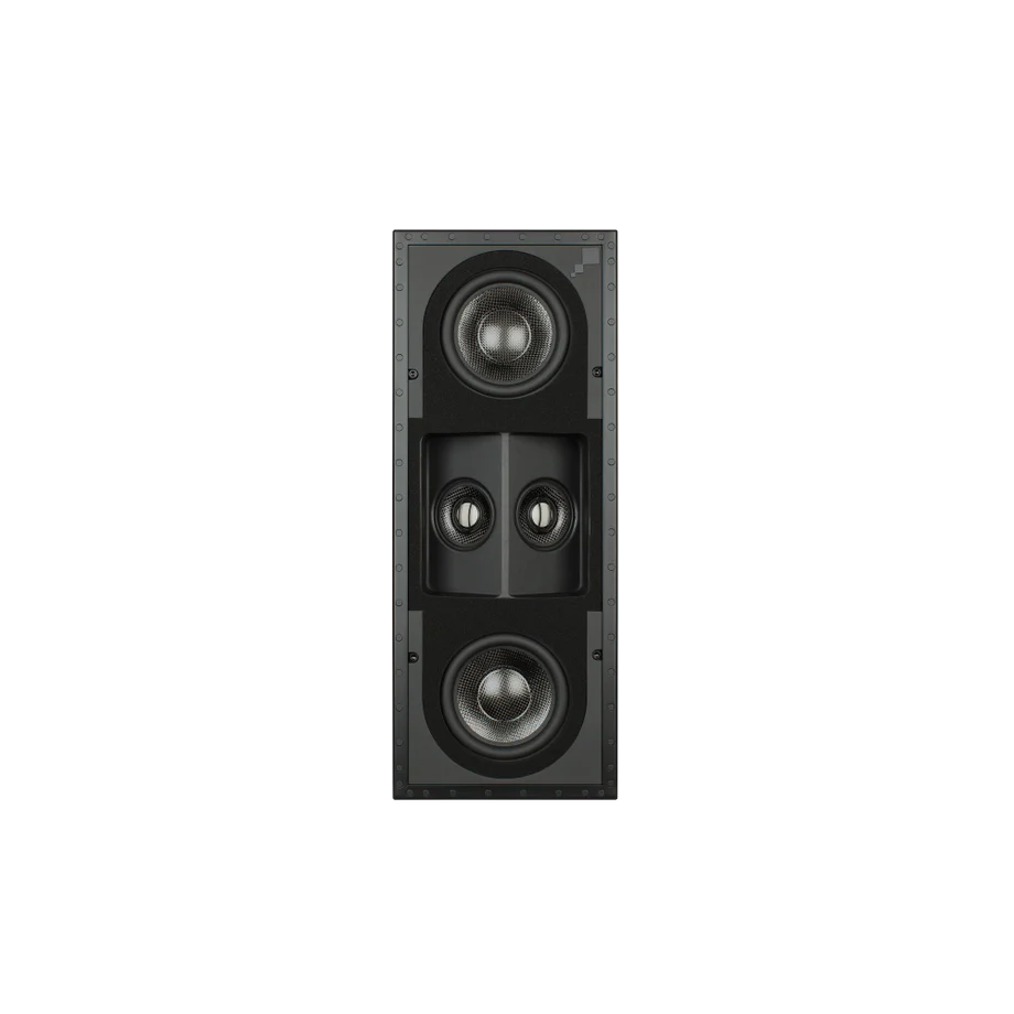 The Sonance Reference R1SUR in-wall surround speaker brings cinema-grade surround performance into a standard 2×4 wall cavity while minimizing visual impact. Designed as part of Sonance’s Reference series, the R1SUR combines fourth-generation coaxial driver technology and separate crossover networks for improved imaging and low distortion. Dual carbon-fiber/Rohacell laminated woofers provide the mid / low energy required for immersive surround channels, while dual ferrofluid-cooled 1″ ceramic dome tweeters reproduce crisp, extended highs. The speaker includes a low-profile, paintable magnetic grille and an integrated enclosure to reduce sound transfer into adjacent rooms — making it ideal for dedicated home theaters or living rooms where both performance and aesthetics matter.
