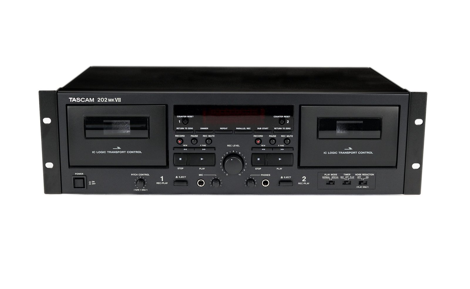 The 202mkV from TASCAM is a professional dual cassette player and recorder that fits in a 3RU rack space, featuring standard line-level stereo RCA connectors for input and output, a front-panel 1/4″ mic input jack with its own level control, and front panel buttons for play, pause, stop, forward, and rewind functions.