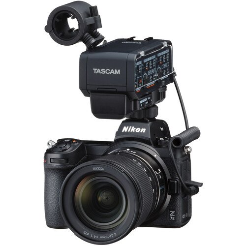 The Tascam CA-XLR2d-AN XLR Microphone Adapter Kit enables high-quality recordings from XLR microphones directly to your camera, attaching via the shoe mount and connecting with an included 3.5mm cable. It features a preamp powered by two AA batteries and 48V phantom power, ideal for mirrorless/DSLR cameras, including models from Nikon.