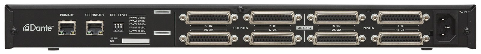 - Supports 32-channel analog line input and output (48 kHz / 96 kHz) through 8 D-Sub connectors.