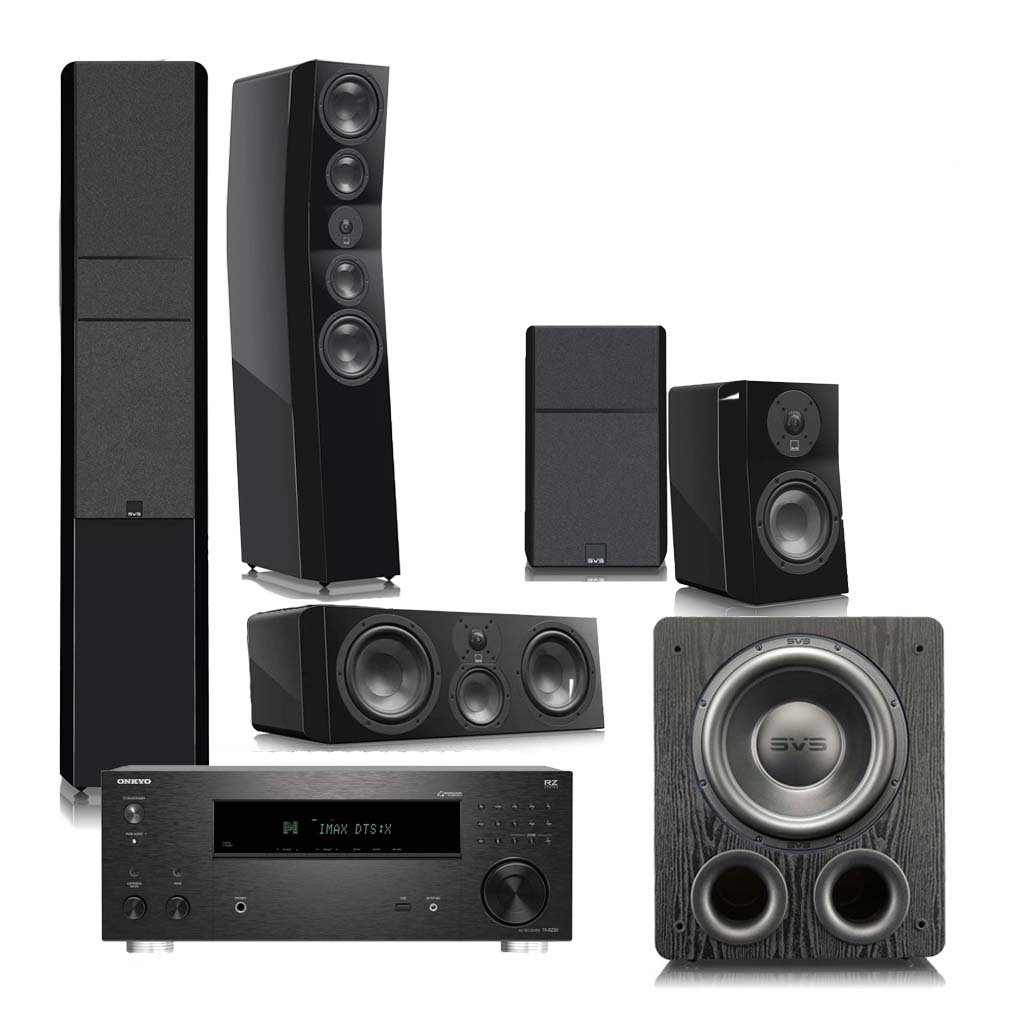Three-way flagship SVS Ultra Evolution tower speakers paired as a 5.1 home-theater system with the Onkyo TX-RZ30 9.2-channel THX-certified AV receiver (with Dirac Live). Delivers pristine clarity, stunning dynamics and authoritative bass — a ready-made premium home-theatre package.