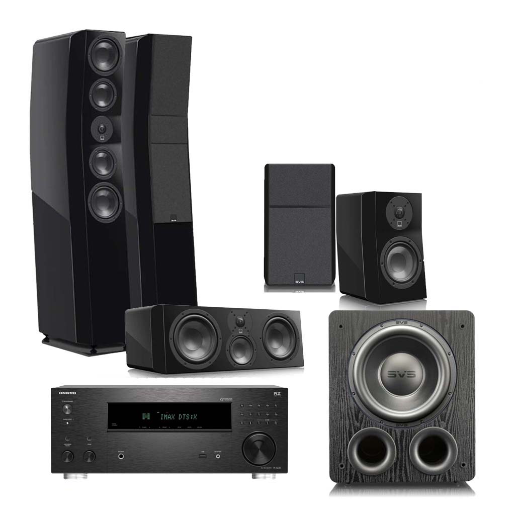 Three-way SVS Ultra Evolution Tower speakers combined into a 5.1 home theatre package with an Onkyo TX-RZ30 9.2-channel THX-certified AV receiver (with Dirac Live). The Ultra Evolution Tower pairs advanced driver arrays, acoustically-centered time alignment, and diamond-coated tweeters for detailed highs, commanding bass, and a wide, precise soundstage — designed for immersive music and home-theatre listening.